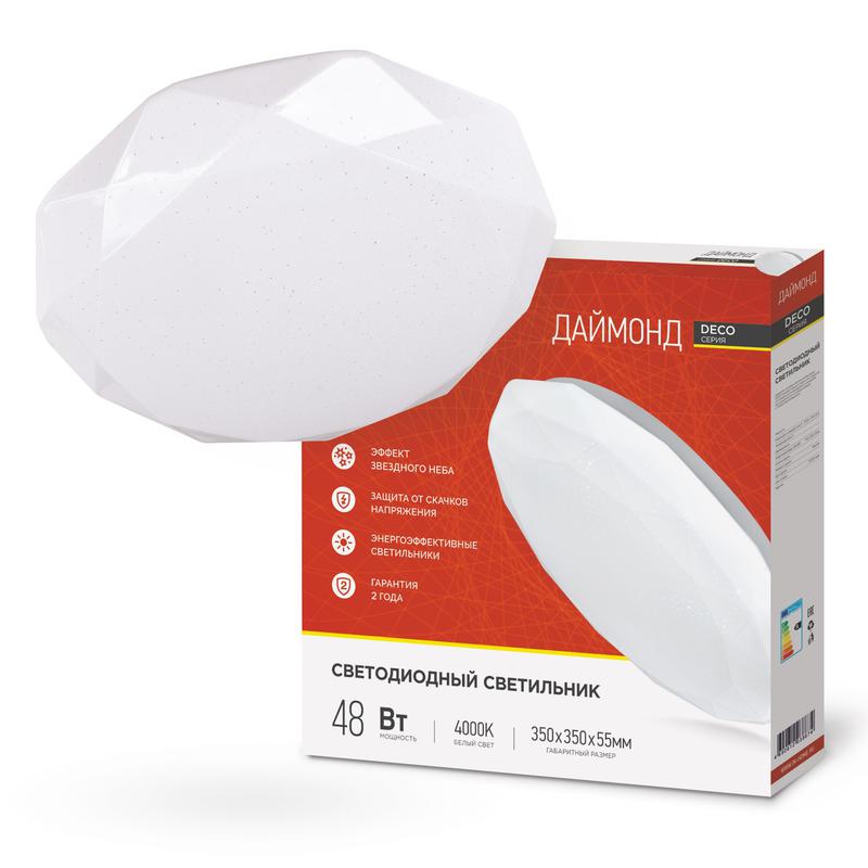 Светодиодный накладной светильник ДАЙМОНД серии DECO от ТМ In Home выполнен в оригинальной форме ограненного бриллианта. При минимальных затратах электроэнергии светильник обеспечивает яркий, но комфортный для глаз свет и гарантирует отсутствие пульсации. Разнообразие модификаций поможет создать оптимальный вариант интерьерного освещения. Линейка светильников ДАЙМОНД DECO In Home представлена в нескольких вариантах размеров и мощностей (от 12 Вт до 48 Вт), что позволяет подобрать оптимальный осветительный прибор, в зависимости от конфигурации и габаритов помещения.