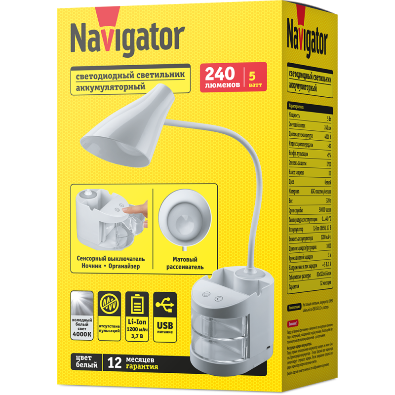 Аккумуляторные светодиодные настольные светильники Navigator серии NDF-D с интегрированным светодиодным модулем — идеальное энергоэффективное решение для локального освещения рабочего места. 2 режима работы: 1. основной свет с 3 уровнями яркости 20%, 50% и 100%; 2. ночник * Сенсорные выключатели * Мягкий, рассеянный свет без пульсаций и слепящего эффекта * Литий-ионный аккумулятор обеспечивает до 6 часов автономной работы в режиме 20% яркости * Заряжается от любого устройства с выходом USB (ноутбук, ПК, портативный аккумулятор, сетевое зарядное устройство), USB-кабель в комплект * Гибкая регулируемая ножка * Органайзер для канцелярских принадлежностей и подставка под смартфон * Современный дизайн в классическом цветовом исполнении * Длина USB-кабеля 1,2 метра
