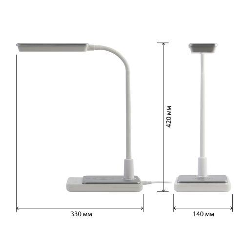 Настольный светильник ЭРА NLED-499-10W-W со светодиодами (LED) в качестве источников света. Оснащен сенсорным управлением с возможностью выбора цветовой температуры (теплый, нейтральный или холодный свет). Плавный диммер для регулировки яркости. Светильник сохраняет выбранные настройки при включении-выключении. Направление света регулируется наклоном и поворотом плафона в любом направлении. Светильник имеет встроенный модуль Qi для беспроводной зарядки мобильных устройств. Просто положите телефон, поддерживающий функцию Qi, на основание светильника в отмеченной зоне - светильник подзарядит его удобно и быстро!