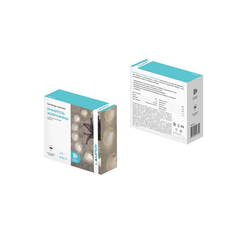 Садовая гирлянда (каскад) Хранитель жемчужины LAMPER - это оптимальное решение для украшения территории загородного дома, дачи или декорирования пространства перед торжеством. Изделие оснащено солнечной панелью и аккумулятором: заряжается днем в течение 6 часов, а с наступлением темноты дарит приятное холодное белое свечение на протяжении 6 часов. Устройство не требует прокладки проводов и дополнительных элементов установки. 10 пластиковых ракушек расположены на шнуре длиной 4 м. Так, гирлянда легко крепится в любом месте. При этом панель незаметно размещается по соседству. Ее можно положить на плоскую поверхность или вставить в грунт (в комплекте идет прочный пластиковый колышек). Каскад имеет высокий уровень пыле- и влагозащиты IP65, поэтому может использоваться в непогоду без навеса.