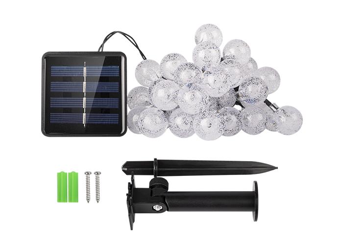 Светодиодный светильник-гирлянда "КРИСТАЛЛИЧЕСКИЕ ШАРИКИ" с солнечной батареей. Предназначен для декоративной подсветки кустарников, альпийских горок, террас, веранд на садовых и дачных участках, балконов и т.п. Автоматическое включение/выключение при наступлении темного/светлого времени суток (датчик освещенности) 8 режимов работы: комбинированный, волнообразный, последовательный, перетекающий, бегущая вспышка, затухающий, мерцающий, постоянный. Время непрерывной работы при полностью заряженном аккумуляторе 8 часов. Материал корпуса светодиодной панели и колышка – ABS-пластик, в гирлянде используется медный провод. Светильник можно устанавливать в грунт и на вертикальную поверхность. Крепеж (два самореза и дюбеля) входит в комплект поставки.