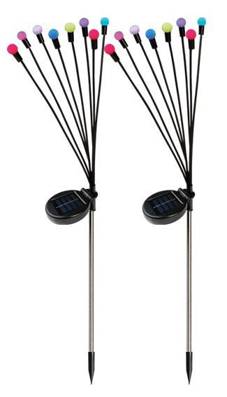 Комплект из 2-х ландшафтных мультицветных светильников «Светлячки» с солнечной батареей. Предназначены для декоративной подсветки клумб, газонов, альпийских горок, дорожек на садовых и дачных участках, а также на дворовых территориях. В темное время суток светильник светится от аккумулятора Ni-MH 600мАч, заряженного в светлое время суток. Время непрерывной работы от полностью заряженного аккумулятора: 8 часов. Время зарядки аккумулятора: 6-8 часов. Источники света - 8 RGB светодиодов. Автоматическое включение/выключение светильника при наступлении темного/светлого времени суток (фотосенсор). Высота светильников 70 см. Степень защиты IP44