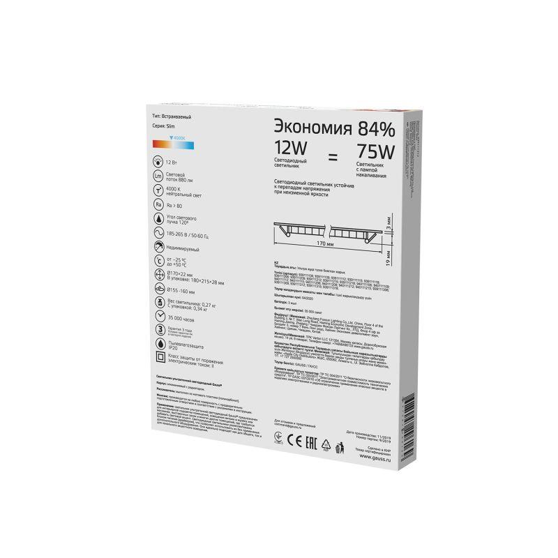 Светильник светодиодный Slim 12Вт 4000К IP20 880лм 220-240В ДВО круг бел. GAUSS 939111212
