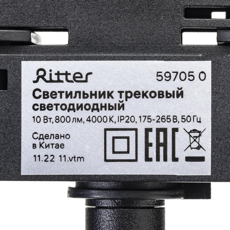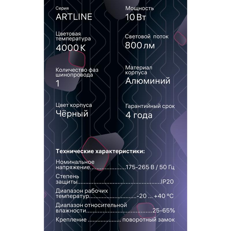 Светильник трековый поворотный светодиодный ARTLINE 55х55х200 10Вт 800Лм 4000К 230В алюм. 5.3кв.м черн. Ritter 59705 0