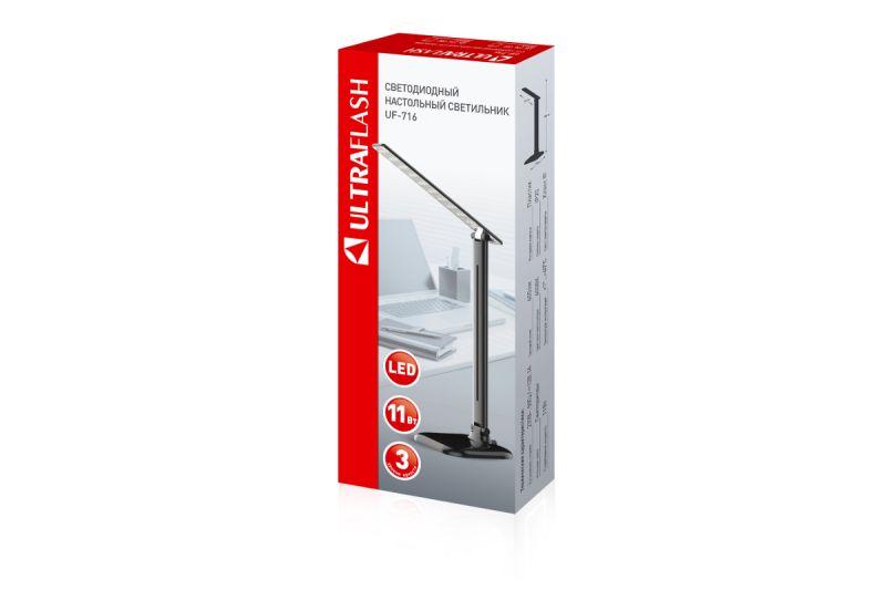 Светильники светодиодные настольные предназначены для освещения индивидуального рабочего пространства на письменном столе. Ultraflash UF-716 C02 черный, размер 150х500х50, источник света - встроенные светодиоды, питание ~230В, 50Гц, мощность 11Вт, цветовая температура 6000К, световой поток - 600лм, материал - пластик. Гарантия 12 месяцев