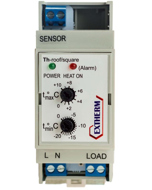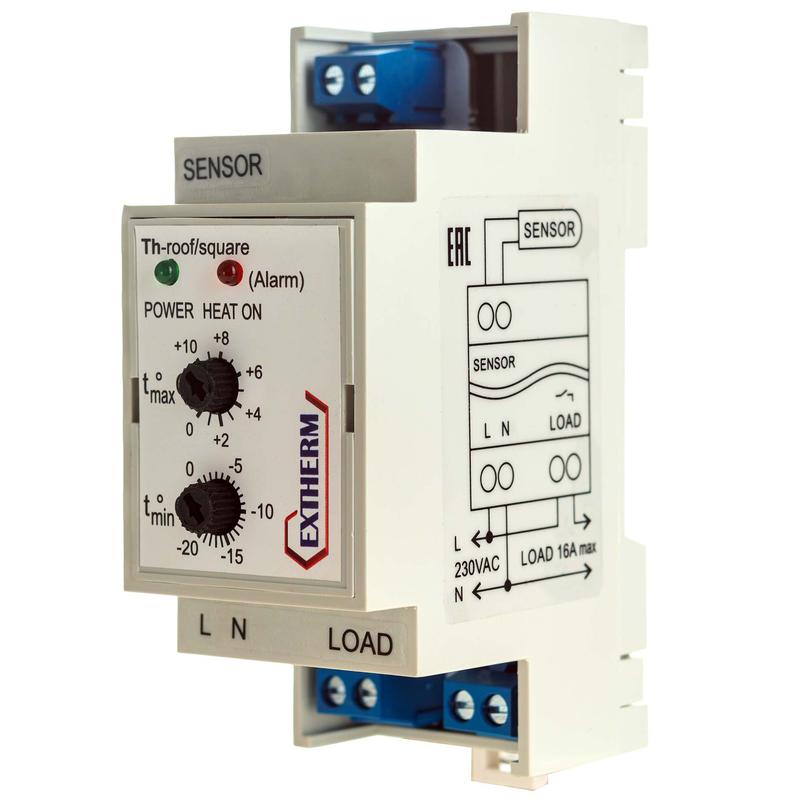 Терморегулятор EXTHERM Th-roof/square предназначен для обогрева крыш, водостоков, площадок, ступеней для монтажа на DIN рейку. Преимущества: • Независимое реле «сухой контакт» NO • Индикация рабочего состояния • Индикация нагрева • Индикация обрыва датчика • Механическая настройка
