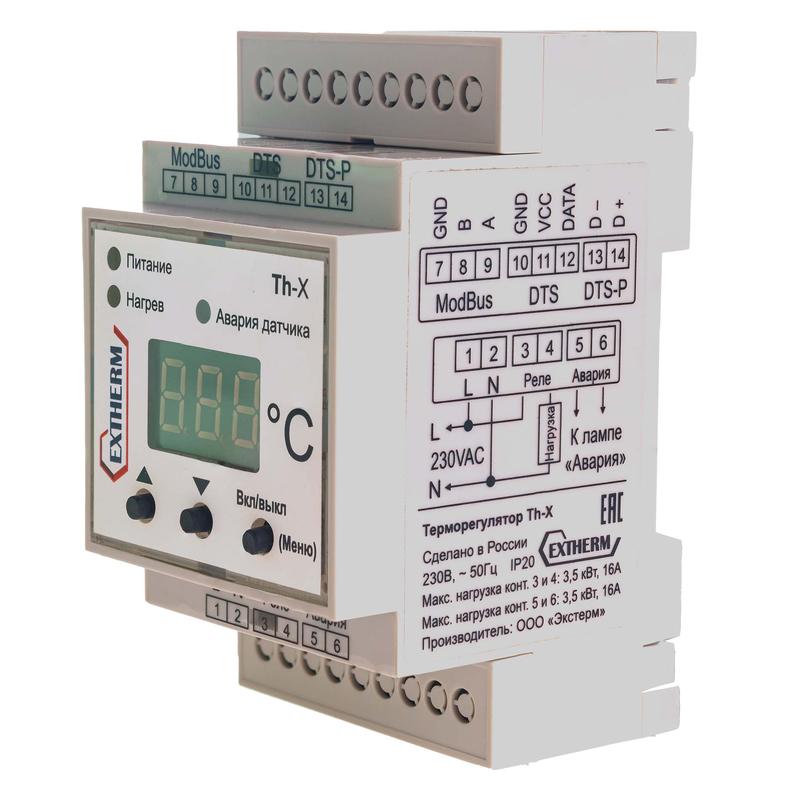 Может использоваться в трех режимах на выбор: для систем антиобледенения кровель и открытых площадей или трубопроводов и резервуаров, или для поддержания фиксированной температуры. Поддерживает передачу данных через интерфейс RS-485, по протоколу MOD_BUS/RTU. Управление терморегулятором возможно автономно и удаленно по протоколу ModBus. К терморегулятору можно подключать один из двух видов датчиков температуры: DTS и DTS-P (поставляются отдельно). При расстояниях до 50 м применяется датчик температуры Extherm DTS. В случаях высокого уровня помех, а также при расстояниях свыше 50 м применяется датчик температуры Extherm DTS-P . При подключенных обоих датчиках работа будет производиться по датчику температуры Extherm DTS. Для монтажа на DIN рейку. Преимущества: • Независимое реле «сухой контакт» NO • Независимое аварийное реле «сухой контакт» NO • Индикация рабочего состояния, нагрева и аварий • 3 алгоритма работы: «Roof», «Pipe», «Fix» • Интеграция в систему диспетчеризации • Удаление датчика до 500 м Применение: • Системы антиобледенения кровель • Системы антиобледенения открытых площадей • Трубопроводы • Резервуары • Морозильные камеры
