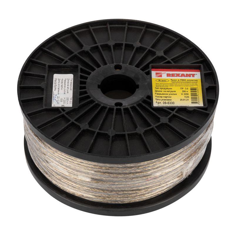 Стальной трос с полимерным покрытием используется для монтажа рекламных растяжек, систем освещения, новогодних конструкций и украшений. Применяется при организации ограждений, а также при оборудовании парников и теплиц. Предназначен для использования при статических нагрузках. Стальной трос свивается из высокоуглеродистой латунированной стальной проволоки и покрывается ПВХ, что обеспечивает устойчивость к воздействию влаги и пресной воды. ПВХ покрытие является экологически чистым и абсолютно безопасным материалом для человека и животных. Срок службы троса составляет более 25 лет (при отсутствии механических повреждений покрытия). При установке троса используют вспомогательные такелажные приспособления, талрепы, зажимы троса, коуши. Диаметр с покрытием: 3,0±0,1 мм. Диаметр без покрытия: 1,10-2,10 мм. Мин. разрывное усилие: 2 200 Н/220 кг.