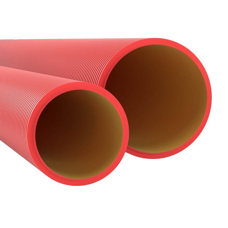Двустенные жесткие трубы предназначены строго для скрытой прокладки: в грунте или в монолите строений. Трубы выдерживают значительные нагрузки, а потому могут использоваться даже в зонах с высокими нагрузками (например, на участках, предназначенных для проезда автотранспорта). Трубы надежно защищают кабель от любых внешних воздействий. Жесткая двустенная труба для кабельной канализации имеет диаметр 125 мм. Кольцевая жесткость (SN) 10 кПа. Поставляется отрезками по 5,70 метров. К каждому отрезку в комплекте идет соединительная муфта. Материал - ПНД. Цвет внешней стенки - красный.