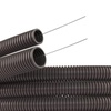 Гофрированные трубы из полиамида рекомендуется прокладывать в пустотах фальш-полов и фальш-потолков, по несгораемым и трудносгораемым основаниям (открыто), а также внутри корпусов оборудования и по ним. Трубы устойчивы не только к воспламенению, но и к воздействию ультрафиолета, а потому для их прокладки не надо организовывать особые условия, чтобы защитить их от воздействия солнечных лучей. Номинальный диаметр 12 мм (это означает, что внутренний диаметр трубы - 12,2 мм, а наружный - 15,8 мм). Специальная протяжка, входящая в комплект, облегчает прокладку кабеля по трубе. Цвет трубы - темно-серый.