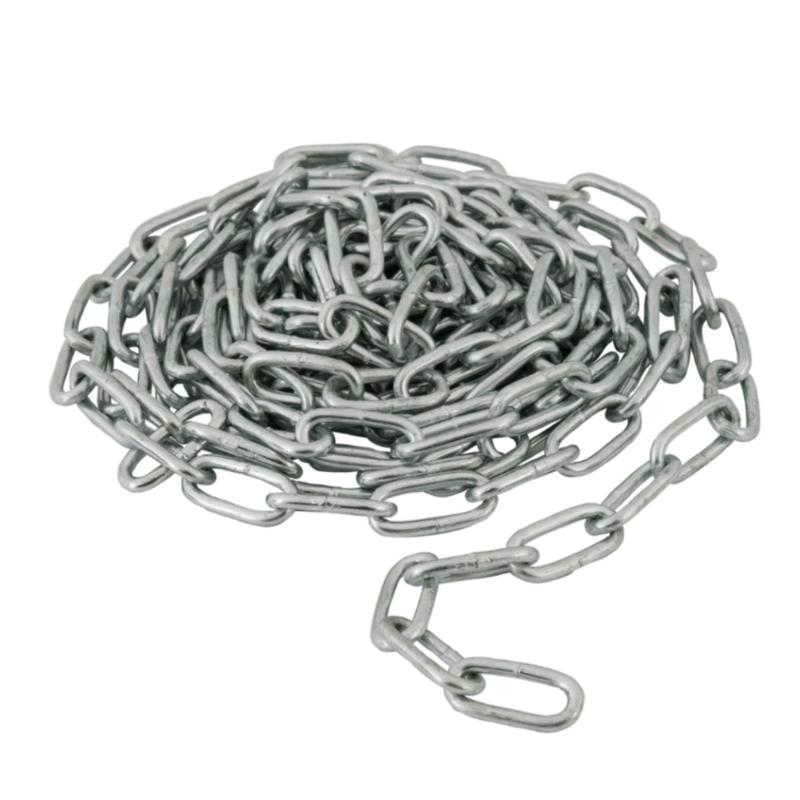 Цепь сварная короткозвенная DIN 766 состоит из коротких стальных звеньев овальной формы, соединенных между собой. Изготовлена из углеродистой стали с антикоррозионным цинковым покрытием. Цепь имеет малый коэффициент растяжения и большую степень свободы, ограниченную одним звеном. Применяется в строительстве и быту для крепления неответственных конструкций (подвески, растяжки и пр.). Допускается использовать для подъема и перемещения грузов в бытовых условиях. Не предназначена для выдерживания ударных нагрузок. Размер цепи соответствует диаметру поперечного сечения проволоки, применяемой при вязке.