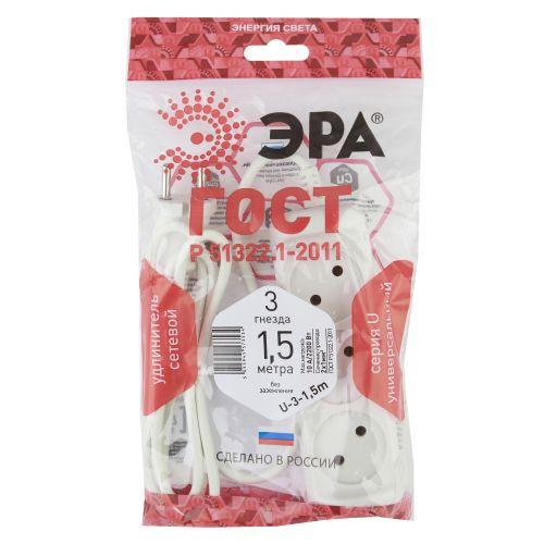 Удлинитель электрический Эра U-3-1,5m без заземления, ПВС, 2x1мм2, 3 розетки, 1,5м. Рассчитан на максимальную мощность 10А/2200 Вт. Удлинитель Эра станет Вашим надежным помощником, если Ваши любимые электроприборы находятся далеко от розеток. Провод в удлинителях Эра сделан из 100% меди, что делает его абсолютно пожаробезопасным. Корпус выполнен из ударопрочного и негорючего пластика (полипропилен). В моделях с заземлением у вилки есть кольцо для удобного извлечения из розетки. Модель удлинителя на 10А позволяет подключить мощные бытовые приборы общей нагрузкой до 2200Вт. Не бойтесь включить чайник, обогреватель, микроволновку или другие электроприборы. Толстый провод удлинителя Эра гарантирует полную безопасность. Дизайн удлинителя разработан в России командой Эра Style.