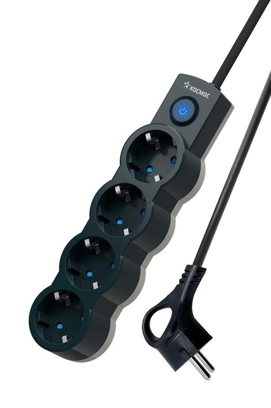 Удлинитель 4х3м с заземл. IP20 с выкл. 10А 2200Вт 220В защ. шторки ПВС 3х1 черн. КОСМОС YKsm3m-4g-Z-V10A-B