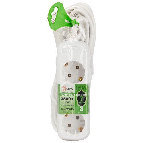 Удлинитель электрический Эра GREENLINE UDL-16-370-E с заземлением, на 3 розетки, провод 7м ПВС 3x1мм2. Рассчитан на максимальную мощность 16А/3500 Вт. Удлинитель станет Вашим надежным помощником, если любимые электроприборы находятся далеко от розеток. Корпус выполнен из ударопрочного и негорючего пластика (полипропилен). Вилка обеспечена кольцом для удобного извлечения ее из розетки. Модель удлинителя на 16А позволяет подключить бытовые приборы общей нагрузкой до 3500Вт.