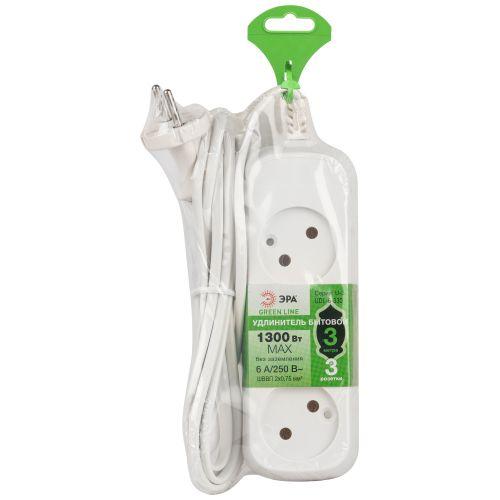 Удобный бытовой удлинитель ЭРА GREENLINE UDL-6-330 на 3 розетки, без заземления. Провод 3м ШВВП 2х0,75мм2. Рассчитан на одновременное подключение к розетке до трёх маломощных электроприборов. Максимальная нагрузка - 6 A/ 1300 Вт. Корпус изготовлен из прочного негорючего полипропилена, в составе - защищающие от возгорания антипирены.