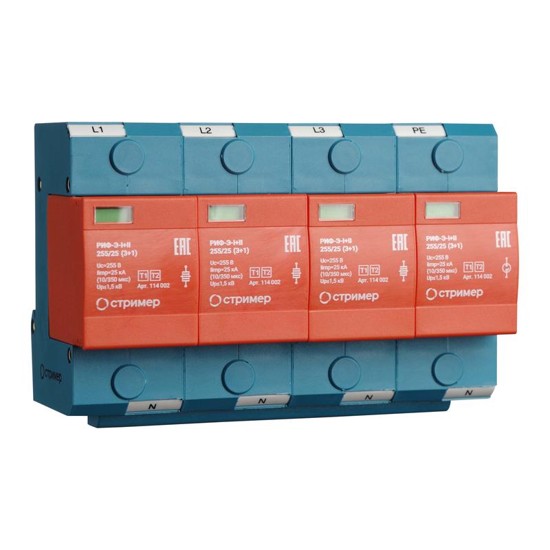 Мощное четыреполюсное УЗИП класса I+II коммутирующего типа со сменными рабочими модулями на основе искровых промежутков и газонаполненного разрядника. УЗИП предназначено для защиты оборудования в низковольтных цепях до 1000 В от прямых и отдаленных молниевых разрядов при воздушном или кабельном вводах электропитания. УЗИП выдерживает токовые нагрузки, соответствующие УЗИП класса I, а по способности ограничения импульсных напряжении?, допустимых для изоляции оборудования, соответствует УЗИП класса II. Устанавливается в пределах 0А(В) – 1 зон молниезащиты (в соответствии с ГОСТ Р МЭК 62305-1 и СО-153-34.21.122). Применяется для сетеи? с системами заземления: TN-S, TT. Предназначено для защиты фазных и нулевого проводников L/N, N/PE от перенапряжении? «провод-провод». Рекомендуемый номинал предохранителя 200 А gL/gG