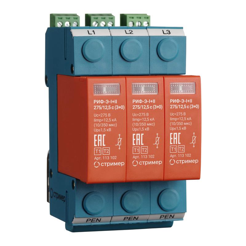 Трехполюсное УЗИП класса I+II ограничивающего типа. УЗИП выполнено в виде трех сменных варисторных модулей, и базы для подключения к сети и креплению на DIN-рейку 35 мм. УЗИП предназначено для защиты оборудования в низковольтных цепях до 1000 В от прямых и отдаленных молниевых разрядов при воздушном или кабельном вводах электропитания. УЗИП выдерживает токовые нагрузки, соответствующие УЗИП класса I, а по способности ограничения импульсных напряжений, допустимых для изоляции оборудования, соответствует УЗИП класса II. УЗИП оснащено контактами дистанционной сигнализации повреждения рабочего элемента. Устанавливается в пределах 0А(В) – 1 зон молниезащиты (в соответствии с ГОСТ Р МЭК 62305-1 и СО-153-34.21.122). Применяется для сетей с системами заземления: TN-C. Рекомендуемый номинал предохранителя 125-200 А gL/gG