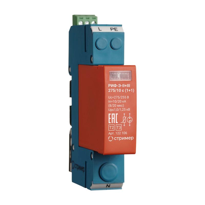 Двухполюсное УЗИП класса II+III комбинированного типа. Предназначено для защиты от вторичных воздействий молнии и коммутационных перенапряжений помехочувствительного оборудования до 1000 В, содержащего электронные схемы. УЗИП выполнено в виде сменного модуля и базы для подключения к сети и креплению на DIN-рейку 35 мм. Рабочими элементами сменного модуля являются варистор и газонаполненный разрядник. Оснащено контактами дистанционной сигнализации повреждения рабочего элемента. Устанавливается в пределах 2-3 зон молниезащиты (в соответствии с ГОСТ Р МЭК 62305-1 и СО-153-34.21.122) непосредственно вблизи защищаемого оборудования. Защищаемое оборудование рекомендуется размещать на расстоянии не более 5 м от УЗИП класса II+III. Применяется для сетей с системами заземления: TN-S, TT. Предназначено для защиты фазного и нулевого проводников от перенапряжений «провод–провод». Рекомендуемый номинал предохранителя 63 А gL/gG.