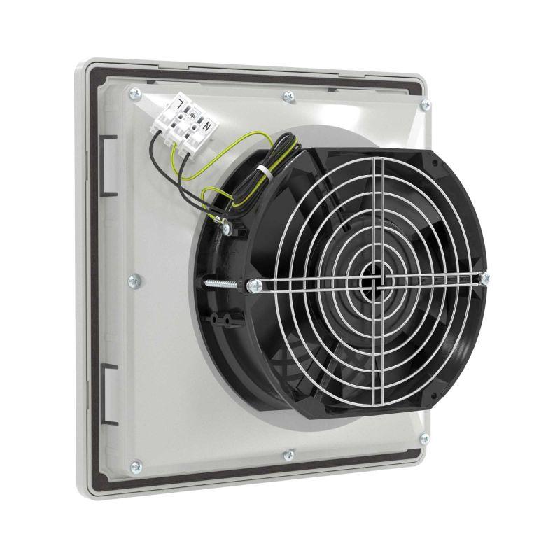 Вентиляторы RV изготовлены в России. Они обладают высоким качеством и надежностью, могут применяться даже в тяжелых условиях эксплуатации. Возможна работа на вдув или на выдув, благодаря простой смене направления вращения. Изготовлены из устойчивого к УФ и не поддерживающего горение АБС–пластика и поликарбоната. Допустима установка на улице без навеса. Степень защиты IP54, опционально повышение до IP56. Монтаж осуществляется без использования инструмента при помощи защелок (опционально можно зафиксировать винтами, например, при вибрационных нагрузках). В комплекте - воздушный фильтр с возможностью быстрой замены без инструмента. Внешние размеры 252х252 мм, размер монтажного выреза 224х224 мм. Номинальный воздушный поток при 50 Гц составляет 230 м3/ч. Цвет - светло-серый, RAL 7035.