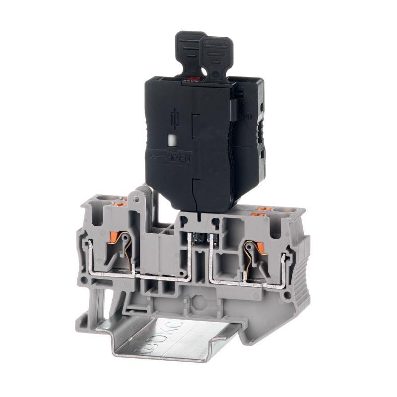 Вставка для предохранителя и светодиодным индикатором на 24 В для клемм с размыкателем TUR-4-MT, TUR-4-MT-P-P, VPR-4-MT, VPR-4-TG, IPR-4-MT, вставляется сверху, для некоторых клемм необходимо извлечь размыкатель перед установкой вставки для предохранителя PP-FUHL. Предназначена для защиты цепи от перегрузки, КЗ и коммутации проводников сечением от 0,2 до 6 мм2. Материал – полиамид, класс негорючести – UL94 V0, цвет – черный. Габариты (В?Ш?Г) – 55?6,5?23 мм.