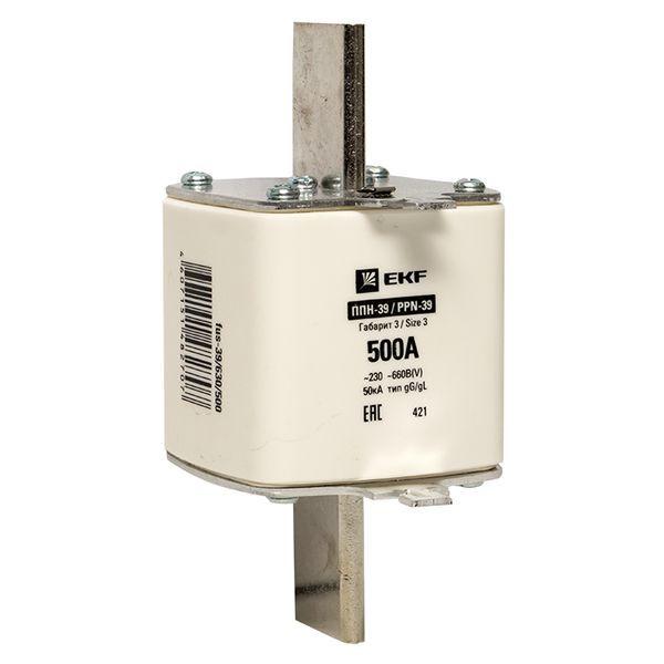 Плавкая вставка ППН-39 630/500А габарит 3 EKF. Предохранители плавкие ППН EKF, укомплектованные плавкими вставками типа gG/gL, предназначаются для защиты кабельных линий и промышленных электроустановок от токов перегрузки и короткого замыкания. Предохранители применяются в электрических сетях переменного тока частотой 50 Гц с напряжением до 660В. Применяются для крепления в распределительных и вводно-распределительных устройствах. Предохранители плавкие ППН могут устанавливаться в основание с держателем, а также в специально предназначенные рубильники. В комплект поставки предохранителей плавких ППН основание с держателем не входит и приобретается отдельно.