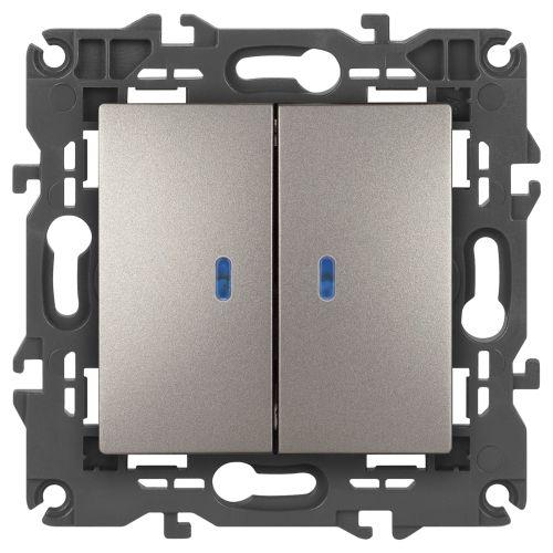 Выключатель 2-клавишный с подсветкой серии Эра Elegance цвет титан 14-1105-16. Характеристики 10А 250В. Оснащён автоматическими клеммами для надёжной фиксации жил кабеля в механизме. Рамки приобретаются отдельно.