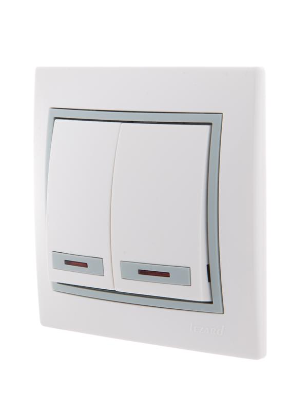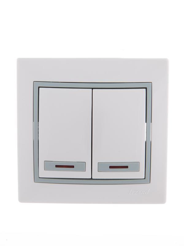 Выключатель 2-кл. СП Mira 10А IP20 с подсветкой с сер. вставкой бел. LEZARD 701-0215-112