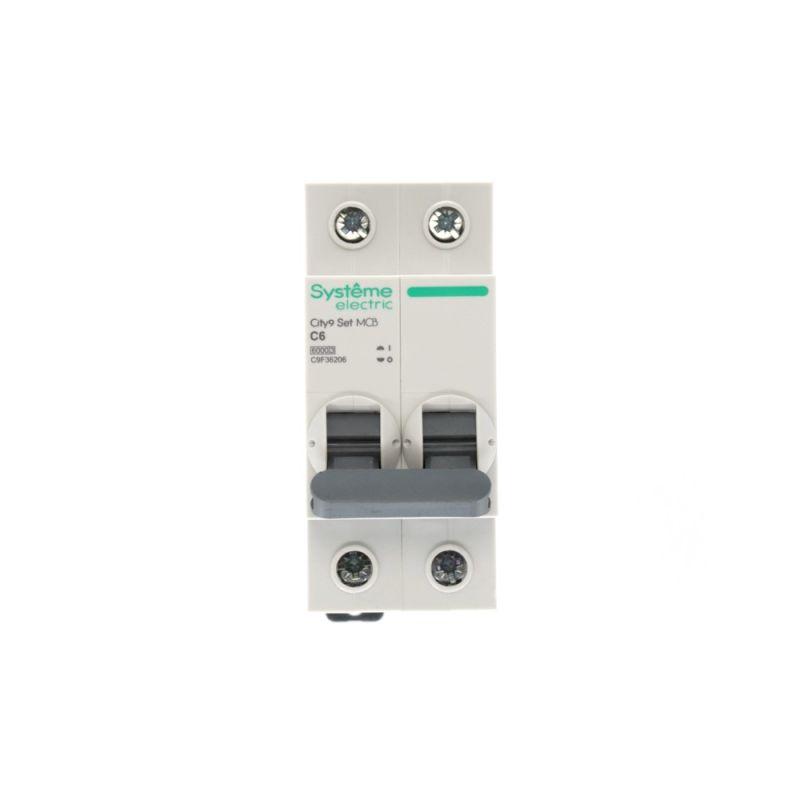 Автоматический выключатель серии City9 Set Systeme Electric, 2-полюсный, номинальный ток 6 А, характеристика С, Icn = 6 кА. Применяется в электрических сетях напряжением 230 В. Предназначен для защиты от перегрузок и токов короткого замыкания. Оснащен механизмом «мгновенной коммутации». Ударопрочный корпус из специального пластика с 6 металлическими заклепками. Безопасные клеммы исключают попадание кабелей в заклеммное пространство.