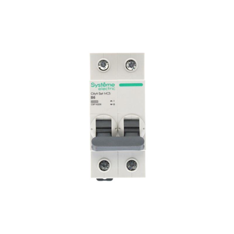 Автоматический выключатель серии City9 Set Systeme Electric, 2-полюсный, номинальный ток 6 А, характеристика B, Icn = 6 кА. Применяется в электрических сетях напряжением 230 В. Предназначен для защиты от перегрузок и токов короткого замыкания. Оснащен механизмом «мгновенной коммутации». Ударопрочный корпус из специального пластика с 6 металлическими заклепками. Безопасные клеммы исключают попадание кабелей в заклеммное пространство.