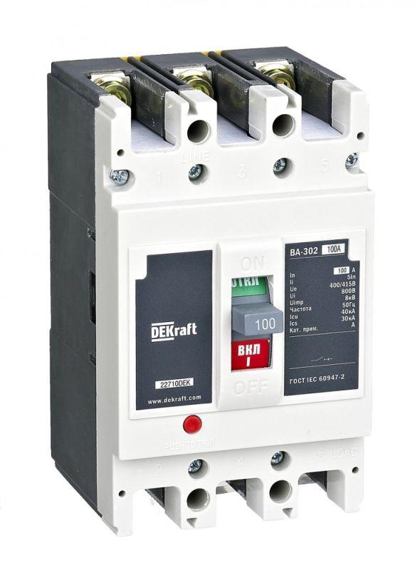 Автоматический выключатель в литом корпусе серии ВА-302L DEKraft; 3P; номинальный ток 50 А; откл. способность Icu = 25 kA (при 400 В пер.тока); уставка мгновенного срабатывания Ii = 5In. В комплект поставки входят 4 межфазные перегородки и крепеж на монтажной плате. Выключатели имеют компактный размер (на 10-15% меньше по сравнению с аналогами), что экономит место в распределительном щите. Уставка срабатывания 5хIn обеспечивает чувствительность к токам КЗ в конце линий большой длины.