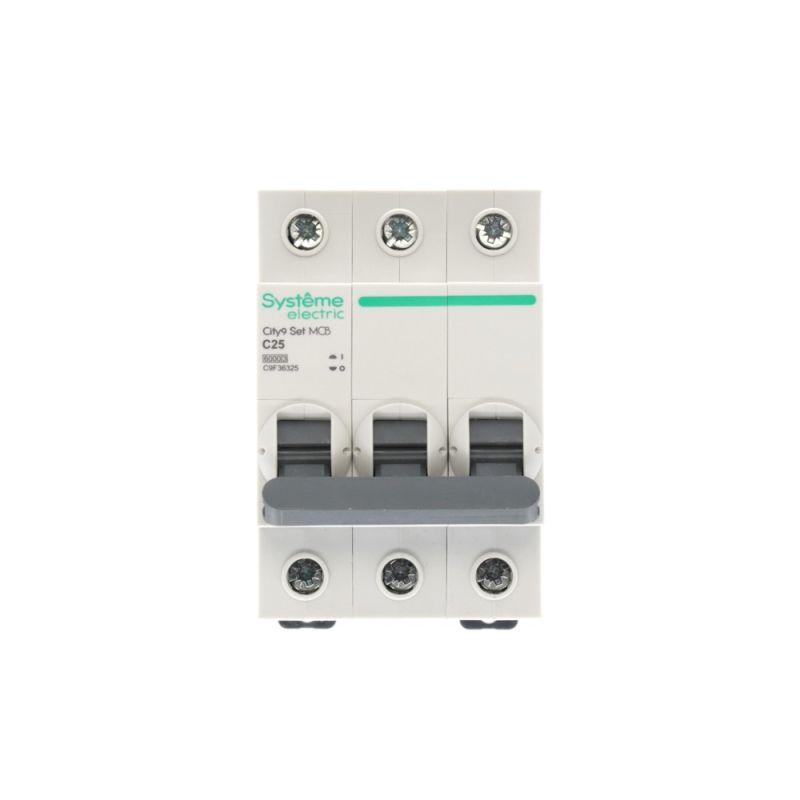 Автоматический выключатель серии City9 Set Systeme Electric, 3-полюсный, номинальный ток 25 А, характеристика С, Icn = 6 кА. Применяется в электрических сетях напряжением 400 В. Предназначен для защиты от перегрузок и токов короткого замыкания. Оснащен механизмом «мгновенной коммутации». Ударопрочный корпус из специального пластика с 6 металлическими заклепками. Безопасные клеммы исключают попадание кабелей в заклеммное пространство.