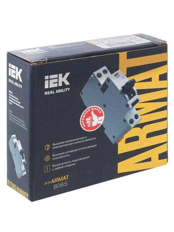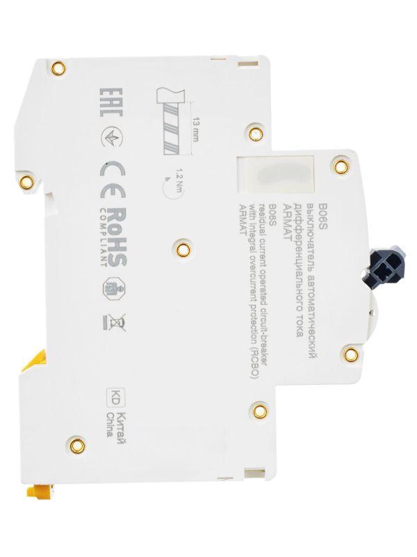 Автоматические выключатели дифференциального тока (АВДТ) ARMAT серии B06S могут осуществляют функции защиты от токов перегрузки и короткого замыкания и защиты человека от токов замыкания на землю. Модельный ряд включает в себя устройства с номинальными токами от 6 до 32 А, характеристиками срабатывания по сверхтоку B и C, типами защит AC и A с номинальным дифференциальным током отключения 30 мА. Номинальная отключающая способность АВДТ ARMAT серии B06S составляет 6 кА.
