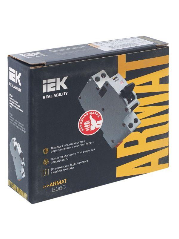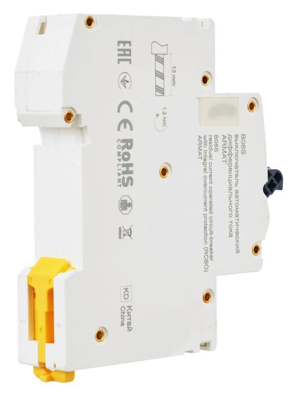 Автоматические выключатели дифференциального тока (АВДТ) ARMAT серии B06S могут осуществляют функции защиты от токов перегрузки и короткого замыкания и защиты человека от токов замыкания на землю. Модельный ряд включает в себя устройства с номинальными токами от 6 до 32 А, характеристиками срабатывания по сверхтоку B и C, типами защит AC и A с номинальным дифференциальным током отключения 30 мА. Номинальная отключающая способность АВДТ ARMAT серии B06S составляет 6 кА.