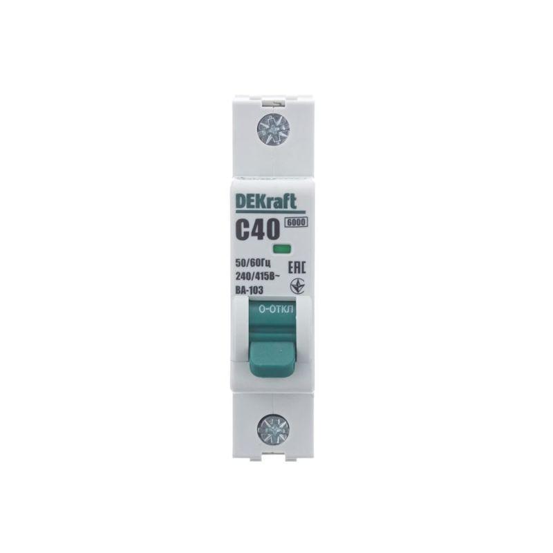 Автоматический выключатель серии ВА-103 NEW Dekraft; 1P; номинальный ток 40 А; характеристика C; отключающая способность 6 кА, что позволяет использовать аппараты в качестве вводных. 5 монолитных заклепок повышают прочность корпуса аппарата. Окошко-индикатор всегда показывает состояние контактов вне зависимости от положения рукоятки управления. Боковые каналы охлаждения повышают стабильность работы при высоких температурах окружающей среды. Есть возможность установки дополнительных аксессуаров с левой стороны устройства. Аппарат на 100% совместим с корпусами и оболочками Dekraft, Systeme Electric.