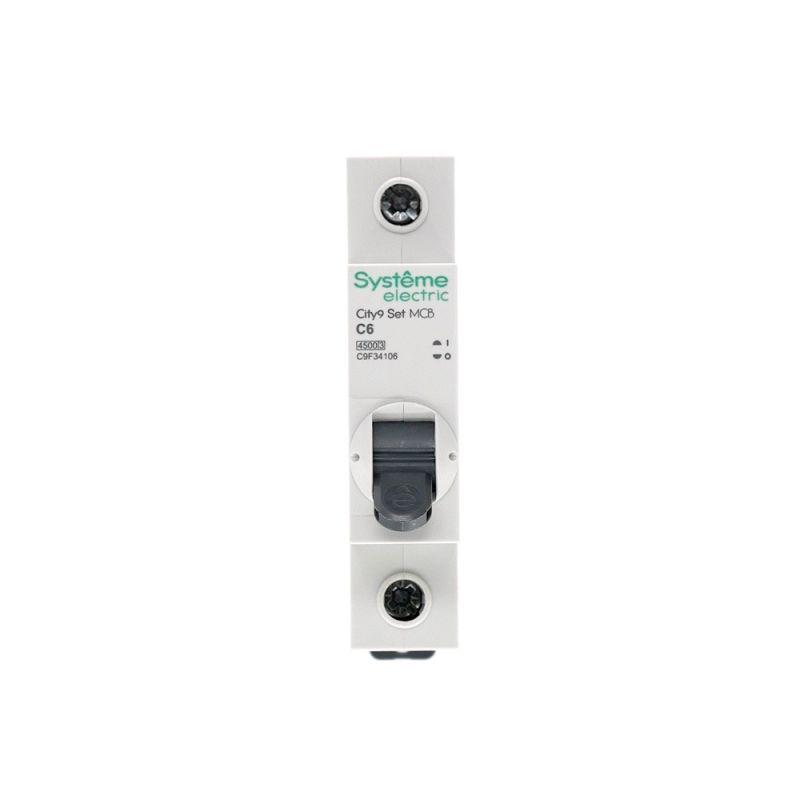 Автоматический выключатель серии City9 Set Systeme Electric, 1-полюсный, номинальный ток 6 А, характеристика С, Icn = 4.5 кА. Применяется в электрических сетях напряжением 230 В. Предназначен для защиты от перегрузок и токов короткого замыкания. Оснащен механизмом «мгновенной коммутации». Ударопрочный корпус из специального пластика с 6 металлическими заклепками. Безопасные клеммы исключают попадание кабелей в заклеммное пространство.