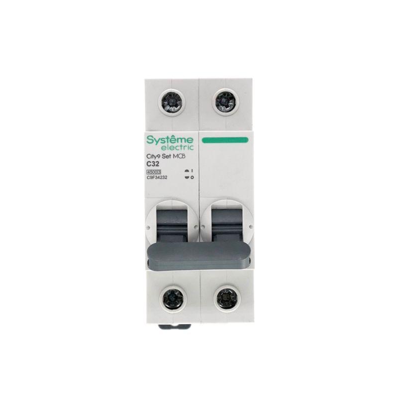Автоматический выключатель серии City9 Set Systeme Electric, 2-полюсный, номинальный ток 32 А, характеристика С, Icn = 4.5 кА. Применяется в электрических сетях напряжением 230 В. Предназначен для защиты от перегрузок и токов короткого замыкания. Оснащен механизмом «мгновенной коммутации». Ударопрочный корпус из специального пластика с 6 металлическими заклепками. Безопасные клеммы исключают попадание кабелей в заклеммное пространство.