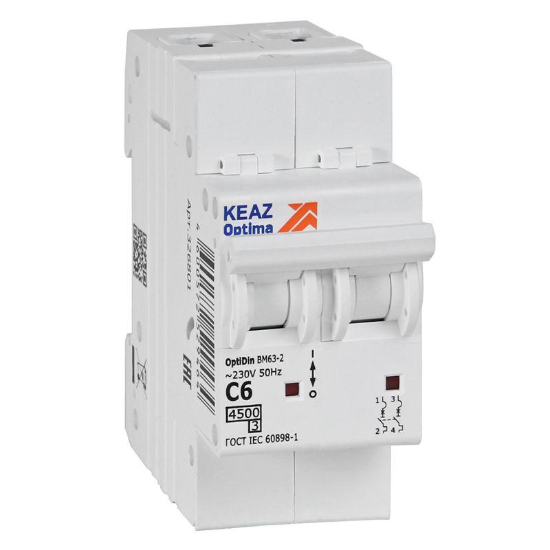 Выключатель автоматический модульный 2п C 6А 4.5кА OptiDin BM63-2C6-4.5-УХЛ3 КЭАЗ 326801