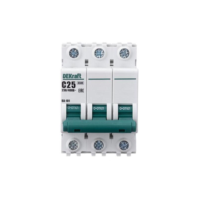 Автоматический выключатель серии ВА-101 Dekraft; 3P; номинальный ток 25 А; характеристика С; отключающая способность 4,5 кА. 5 монолитных заклепок повышают прочность корпуса аппарата. Сплошная лицевая панель обеспечивает безопасность эксплуатации аппарата. Боковые каналы охлаждения повышают стабильность работы при высоких температурах окружающей среды. Есть возможность установки дополнительных аксессуаров с левой стороны устройства. Аппарат на 100% совместим с корпусами Dekraft и Systeme Electric.
