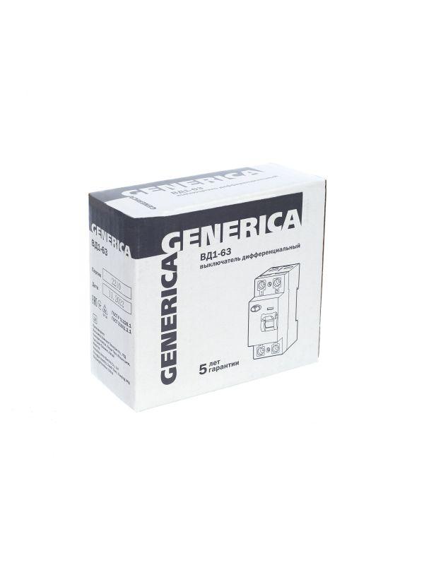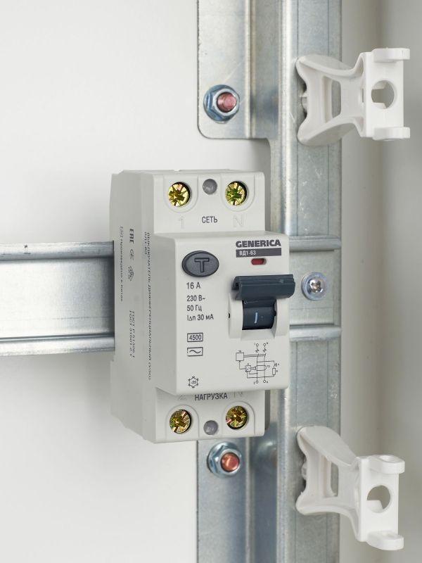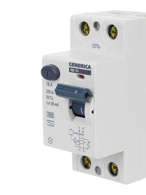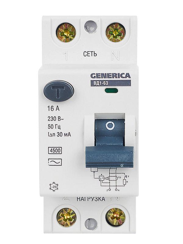 Быстродействующий защитный выключатель ВД1-63 (УЗО) GENERICA - устройство электронного типа, зависящее от напряжения и реагирующее на дифференциальный ток, без встроенной защиты от сверхтоков. Предназначен для защиты человека от поражения электрическим током.