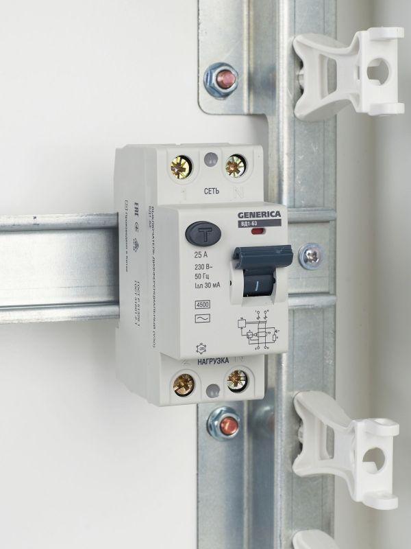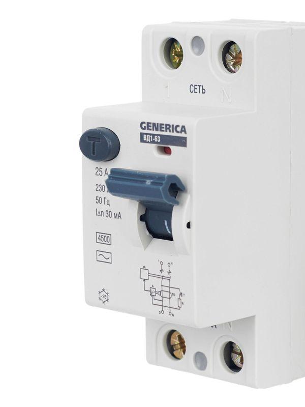 Быстродействующий защитный выключатель ВД1-63 (УЗО) GENERICA - устройство электронного типа, зависящее от напряжения и реагирующее на дифференциальный ток, без встроенной защиты от сверхтоков. Предназначен для защиты человека от поражения электрическим током.