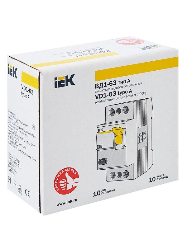 Дифференциальный выключатель ВД 1-63 тип А без встроенной защиты от сверхтоков реагирует не только на синусоидальные переменные дифференциальные токи, но и на пульсирующие постоянные дифференциальные токи. Источником пульсирующего тока являются, например, стиральные машины с регуляторами скорости, регулируемые источники света, телевизоры, видеомагнитофоны, персональные компьютеры и др. Дифференциальный выключатель ВД 1-63 тип А соответствует требованиям ГОСТ 50326 и ГОСТ 50807 как дифференциальный выключатель, "функционально не зависящий от источника питания". Дифференциальный выключатель ВД 1-63 тип А предназначен для защиты человека от поражения электрическим током при случайном непреднамеренном прикосновении к токоведущим частям электроустановок в сетях переменного тока напряжением 230/400 В и частотой 50 Гц. Дифференциальный выключатель ВД 1-63 тип А выпускается в 2-х и 4-х полюсном исполнении на номинальные токи 16А, 25А, 32А, 40А, 50А, 63А и номинальные отключающие дифференциальные токи 10мА, 30мА, 100мА.