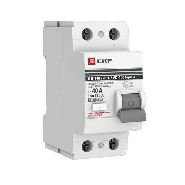 Выключатель дифференциального тока (УЗО) 2п 40А 30мА тип A ВД-100 (электромех.) PROxima EKF elcb-2-40-30-em-a-pro