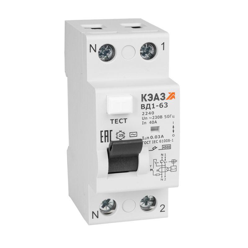 Выключатель дифференциального тока (УЗО) 2п 40А 30мА тип AC ВД1-63 2240 УХЛ4 КЭАЗ 221905