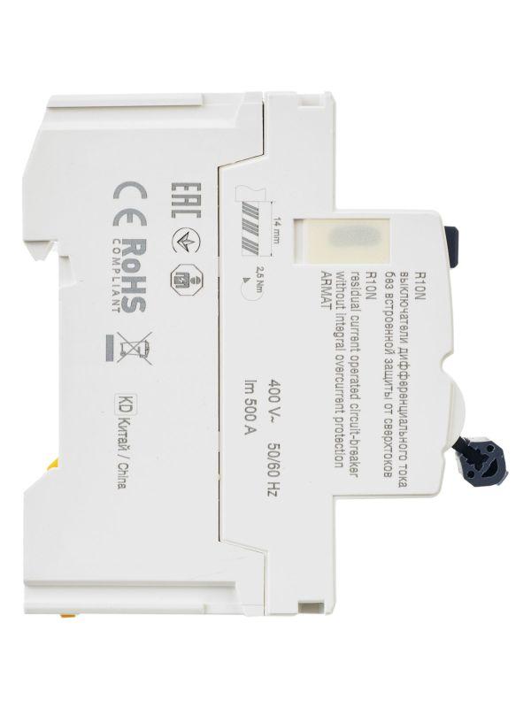 Выключатели дифференциального тока ARMAT серии R10N выполняют функцию защиты поражения человека электрическим током, а так же защиты от пожара при возникновении замыкания на землю. Модельный ряд включает в себя устройства с типами защитных характеристик по дифференциальному току AC, A, AC-S, A-S; номинальными токами от 25 до 100 А; номинальными дифференциальными токами срабатывания от 10 до 300мА. Условная отключающая способность ВДТ ARMAT серии R10N составляет 10 кА.