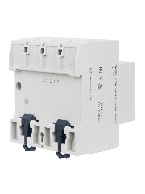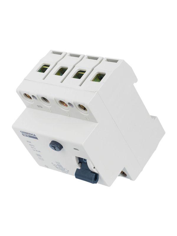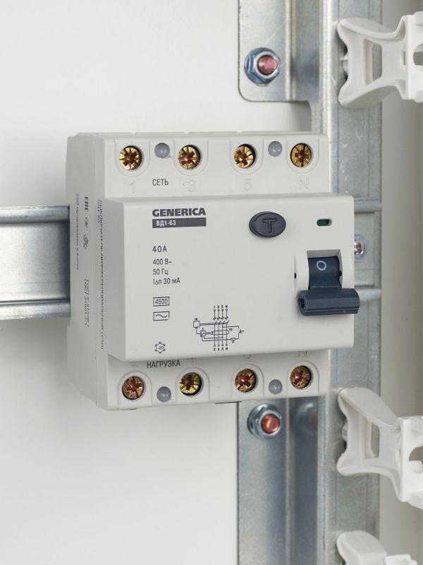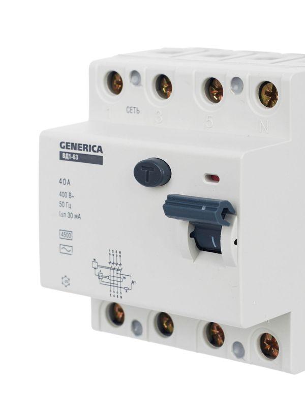 Быстродействующий защитный выключатель ВД1-63 (УЗО) GENERICA - устройство электронного типа, зависящее от напряжения и реагирующее на дифференциальный ток, без встроенной защиты от сверхтоков. Предназначен для защиты человека от поражения электрическим током.