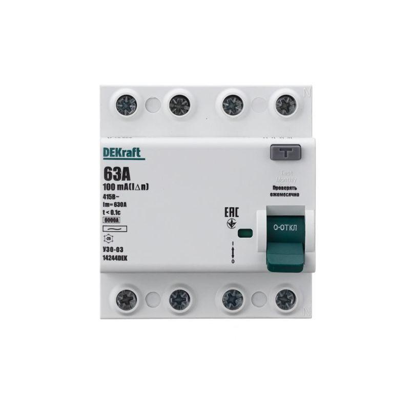 Выключатель дифференциального тока серии УЗО-03 Dekraft; 4P; номинальный ток 63 А; ном.дифф. ток 100 мА; электромеханический; тип дифференциального расцепителя - AC; на DIN-рейку. ВДТ устанавливаются в сетях напряжением до 400 В пер.тока. ВДТ применяются для защиты электроустановок от риска возникновения пожаров вследствие утечек тока. Конструкция устройств позволяет эксплуатировать их даже при низкой температуре. При сборке выключатель дифференциального тока (ВДТ) и автоматический выключатель (для защиты ВДТ) устанавливаются последовательно, при этом номинальный ток аппарата должен быть на одну ступень выше — т. е. 20А при установке последовательно с автоматом на 16А, 32А при установке с автоматом на 25А.