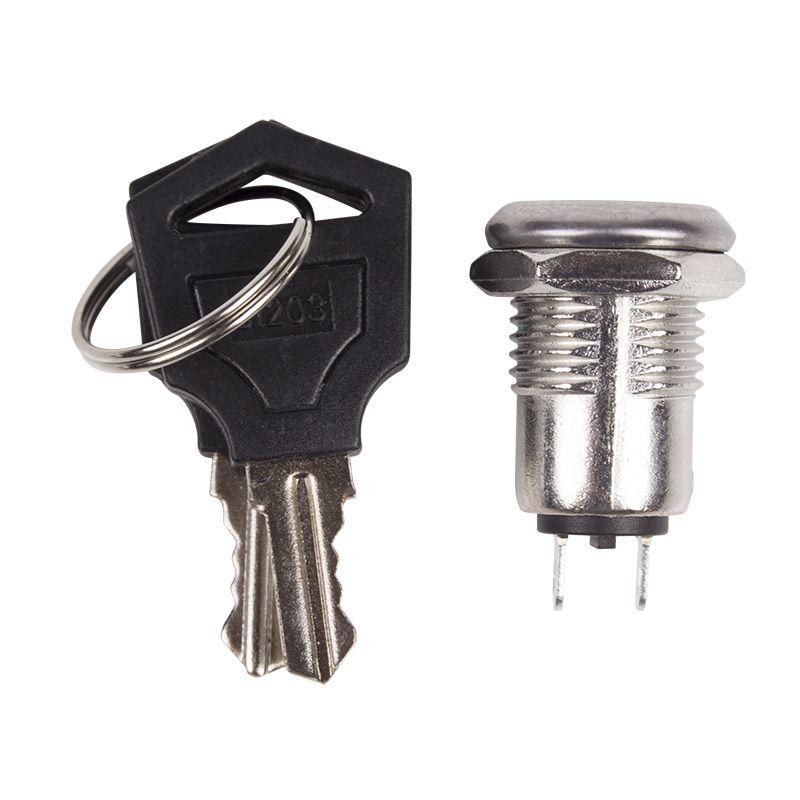 Выключатель ключ O12 250V 0.5А (2с) ON-OFF предназначен для коммутации электрических цепей переменного тока напряжением 250В. Выключатель-ключ применяются в качестве комплектующих изделий различного электрооборудования (блоках питания, электроустановках на различных производствах, автомобилях, и многих других местах). Такой переключатель имеет два положения. Для переключения в нужное положение установите ключ (поставляется в комплекте) и приложите некоторые усилия на него. Монтаж осуществляется без применения винтов на плоских панелях толщиной от 0.8мм до 3мм. Подключение контактов осуществляется с помощью пайки. Основные характеристики: Номинальное напряжение: 250V(AC) / 24V(DC) ; Номинальный ток: 0.5A; Тип переключения: ON-OFF; Количество контактных групп: 1; Количество контактов в контактной группе: 2; Фиксация положений: да; Индикатор коммутационных положений: отсутствует; Рабочая температура: от -25? до +75?; Степень защиты (IP) : IP30; Ресурс: 10 000 циклов.