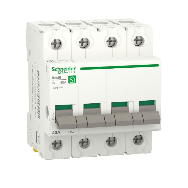 Выключатели нагрузки (рубильники) Resi9предназначены для разрыва электрической цепи под нагрузкой. В коллекции Resi9 представлены выключатели от 1 до 4 полюсов с номинальным током 40А и 63А.
