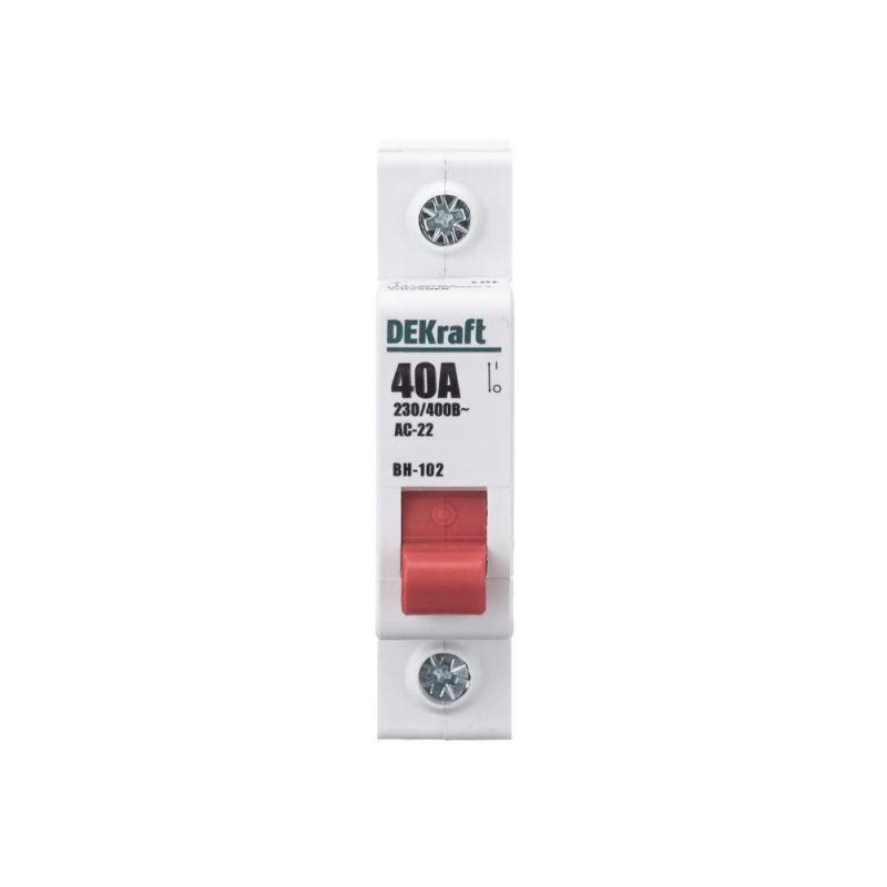 Выключатель-разъединитель серии ВН-102 Dekraft; 1P; номинальный ток 40 А; установка – на DIN-рейку; установочное положение - любое. Выключатели-разъединители применяются для ручного включения/отключения сетей напряжением до 400 В. Специальные мостиковые контакты обеспечивают надежный разрыв цепи; они полностью исключают возможность перекрытия дугой по изоляции. Усиленная рукоятка управления обеспечивает большое количество включений/отключений.