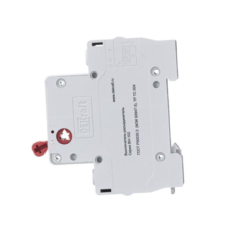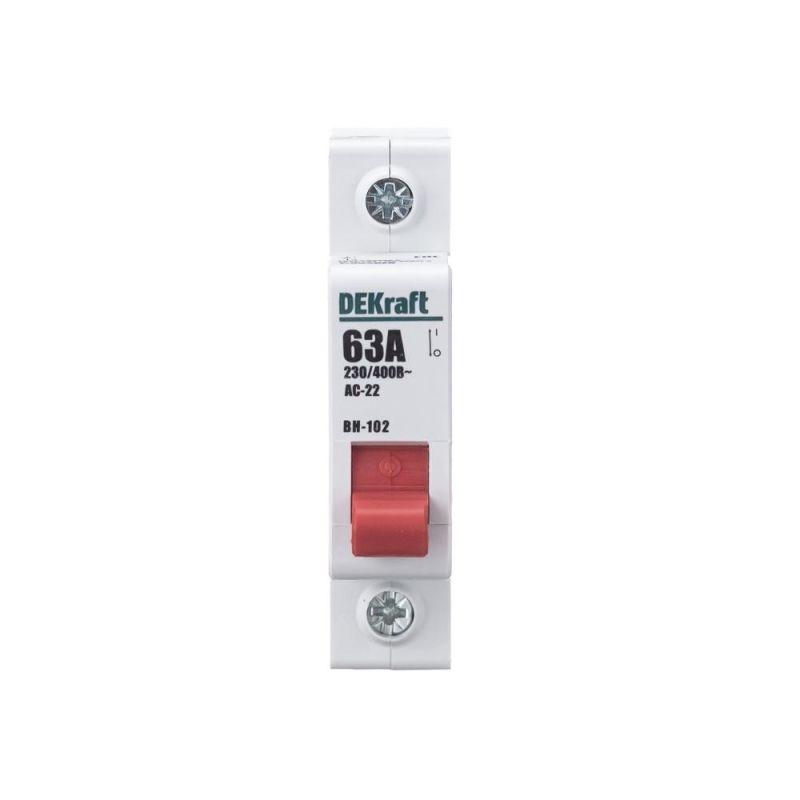 Выключатель-разъединитель серии ВН-102 Dekraft; 1P; номинальный ток 63 А; установка – на DIN-рейку; установочное положение - любое. Выключатели-разъединители применяются для ручного включения/отключения сетей напряжением до 400 В. Специальные мостиковые контакты обеспечивают надежный разрыв цепи; они полностью исключают возможность перекрытия дугой по изоляции. Усиленная рукоятка управления обеспечивает большое количество включений/отключений.